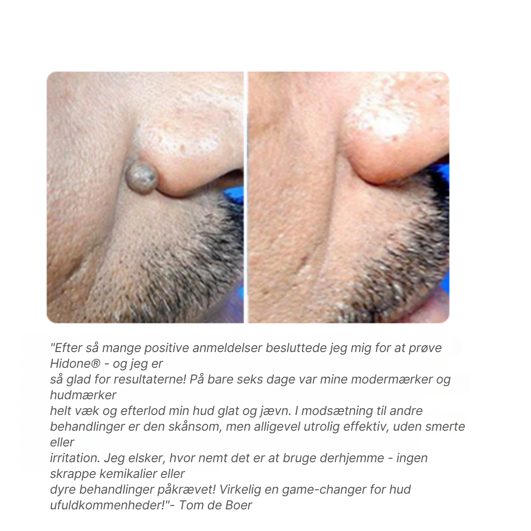 "Efter at have set så mange positive anmeldelser besluttede jeg mig for at prøve Hidone™ - og jeg er begejstret for resultaterne! På bare seks dage var mit modermærke og mine hudmærker helt væk og efterlod min hud glat og fejlfri. I modsætning til andre behandlinger er den skånsom, men alligevel utrolig effektiv, uden smerte eller irritation. Jeg elsker, hvor nemt det er at bruge derhjemme - ingen skrappe kemikalier eller dyre procedurer er nødvendige! I sandhed en game-changer for ufuldkommenheder i huden!" - John Sebastian