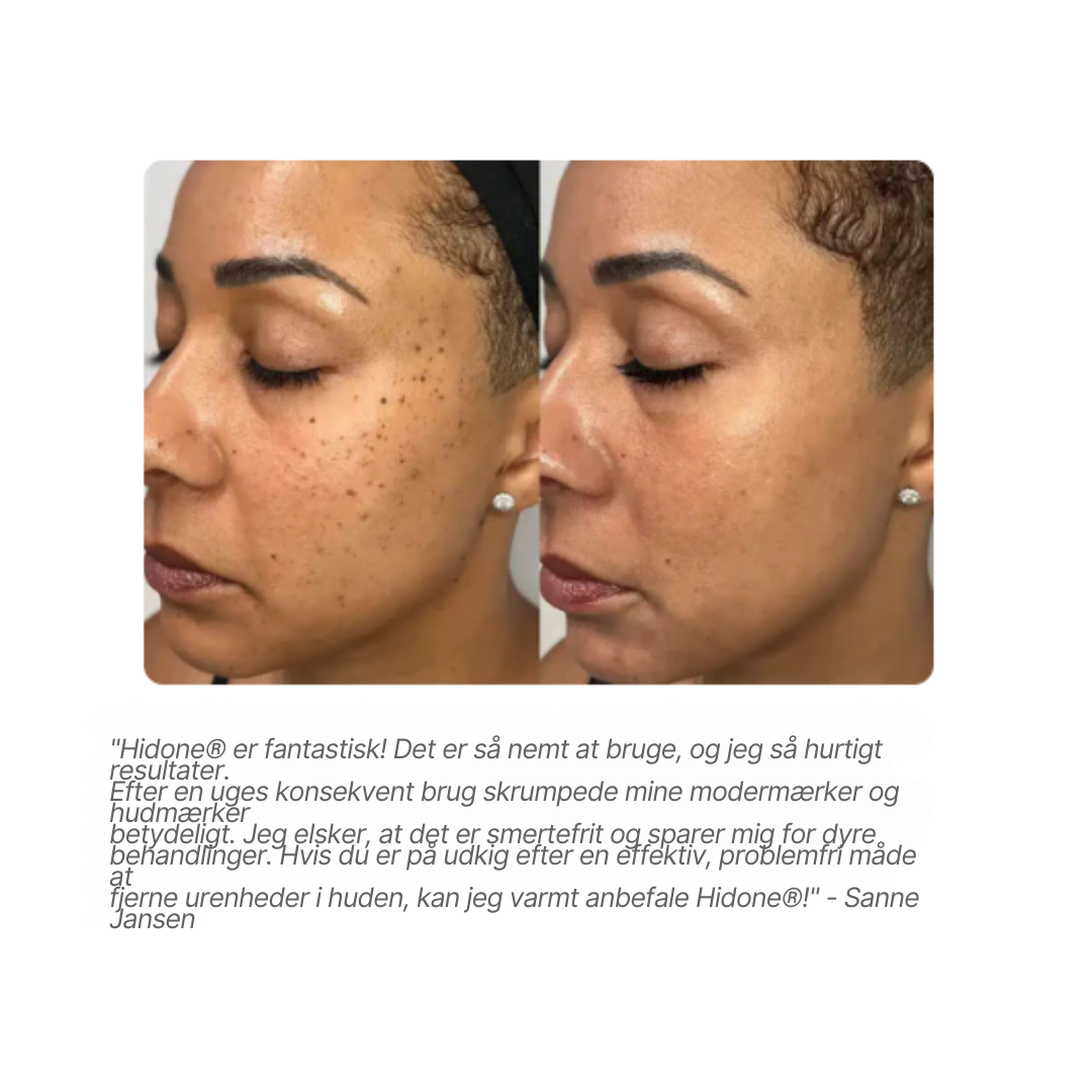 Hidone™ er fantastisk! Den er så nem at bruge, og jeg så hurtigt resultater. Efter en uges konsekvent brug var mine modermærker og hudmærker skrumpet betydeligt. Jeg elsker, at det er smertefrit og sparer mig for dyre behandlinger. Hvis du leder efter en effektiv og problemfri måde at fjerne ujævnheder i huden på, kan jeg varmt anbefale Hidone™!" - Olivia Smith